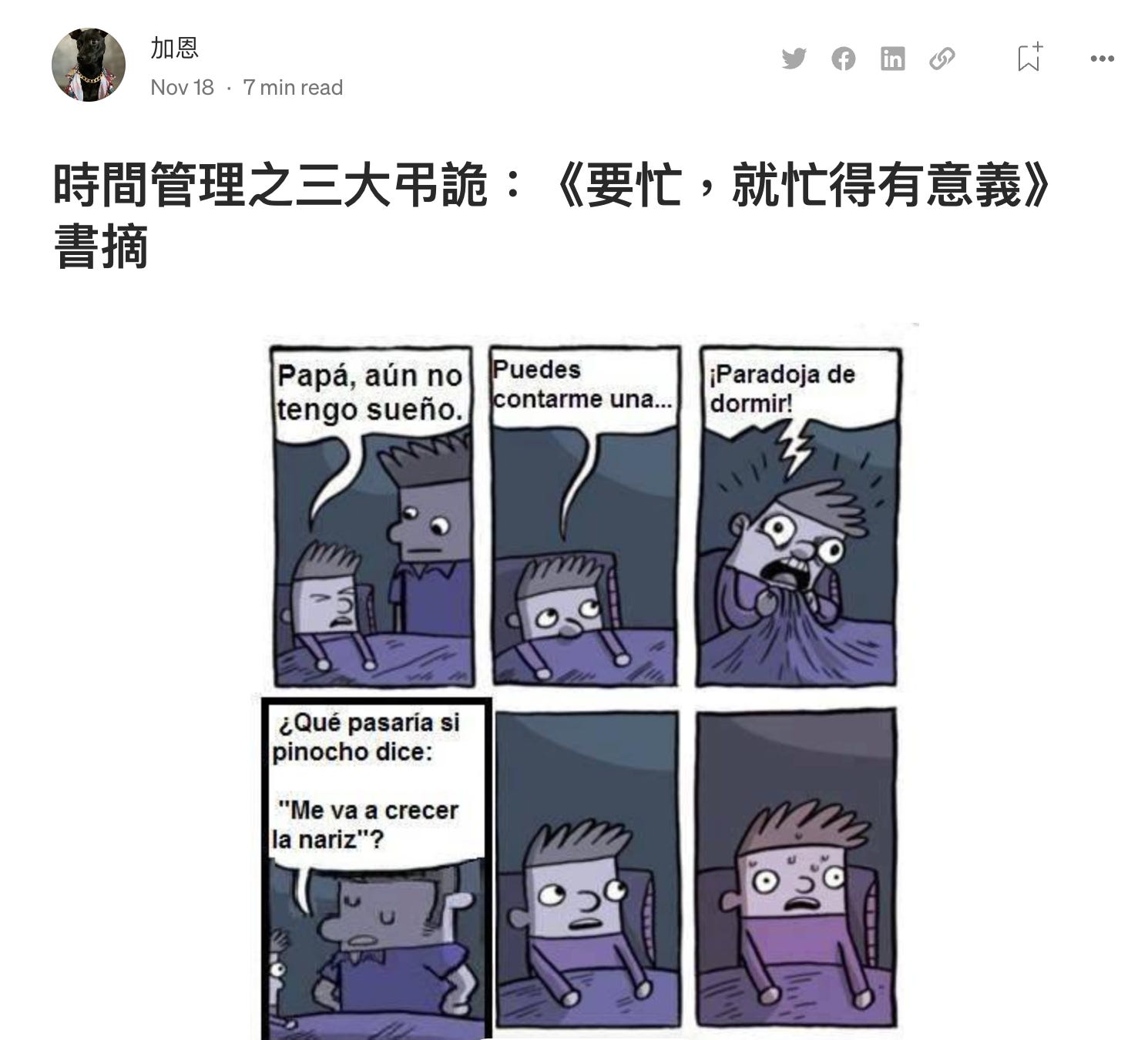 我超愛這張迷因的:「爸爸我睡不著,跟我說一個…睡前床邊弔詭!」「如果小木偶說『我鼻子要變長了』,那會發生什麼事?」