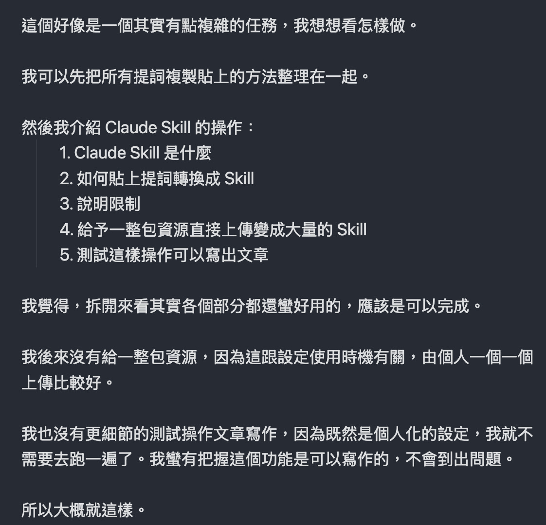 這點是跟 AI 學的。提詞工程中有個概念叫「思維鏈」(Chain of Thoughts, CoT),讓語言模型把它打算怎樣回應使用者的思考先寫下來,就可以顯著提升產出品質。