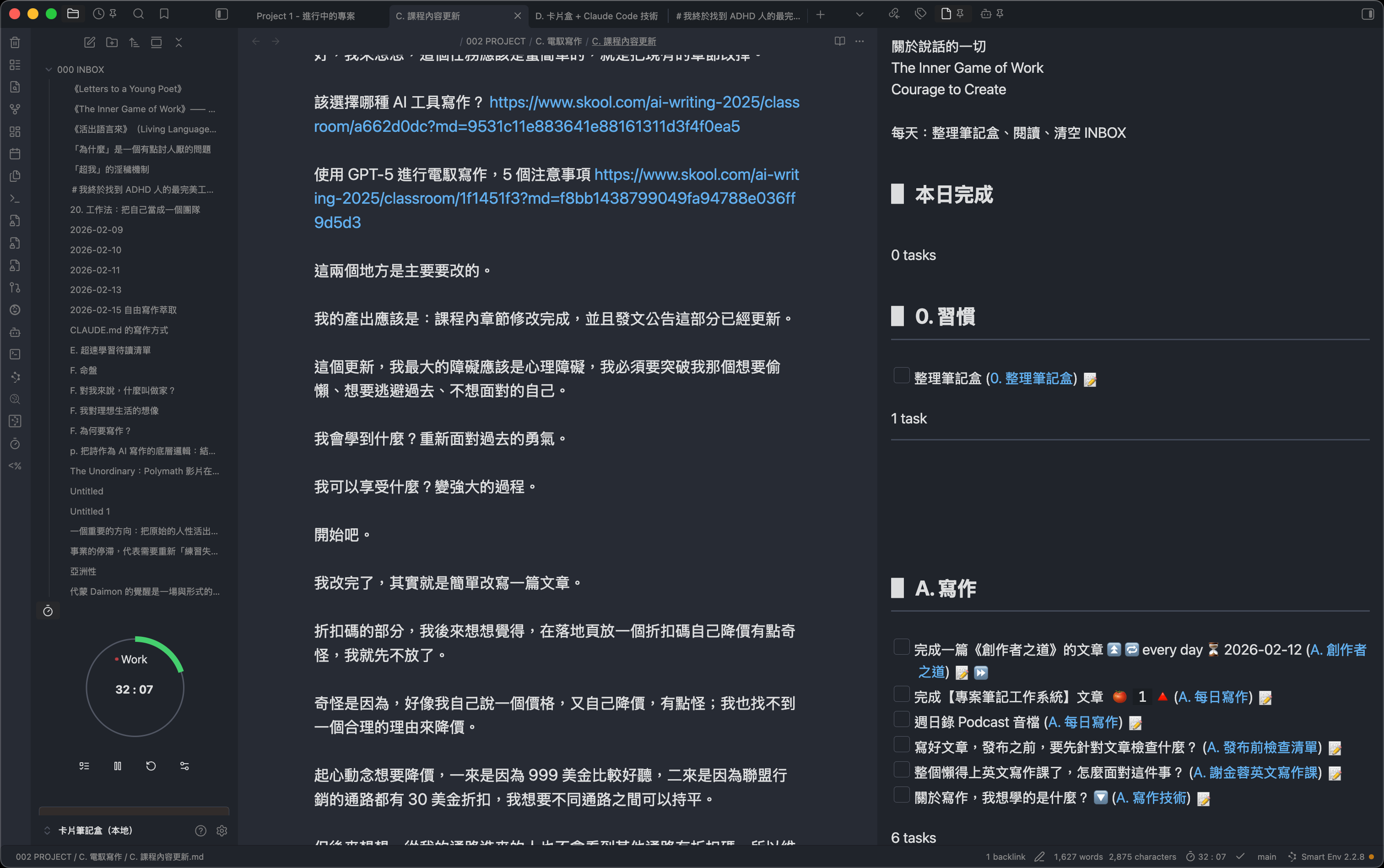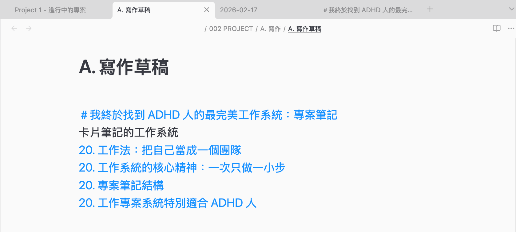這對 ADHD 人是非常友善的:這套建立在寫作上的工作系統,允許我不斷切換專案,一天可以推進 3~5 個專案也不會造成資訊過載,大腦是平靜的。