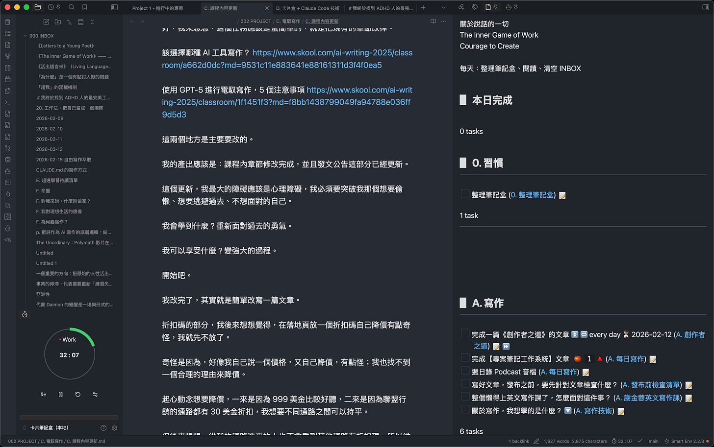 這樣比我之前只會在日誌裡寫,有效太多了,我可以整理出一個「當前理解」,也看得見我的思路怎樣演變。