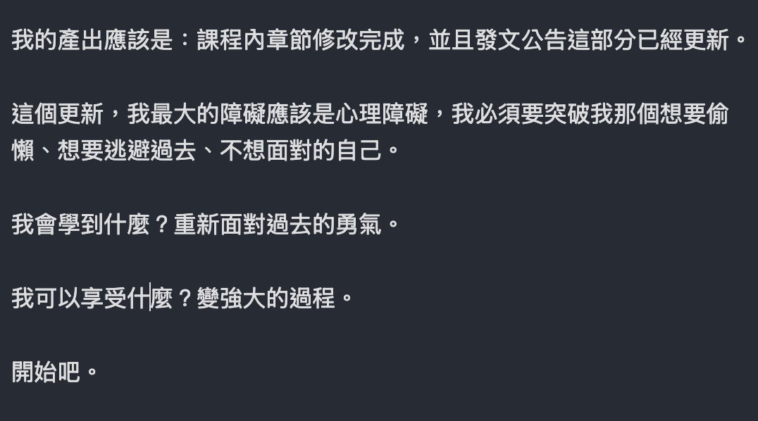 在這次大停機之後,我一直在逃避拖延回來更新《AI 電馭寫作》社群的內容,內心有很多心魔擋著。在寫這個專案筆記的時候,我寫下了: