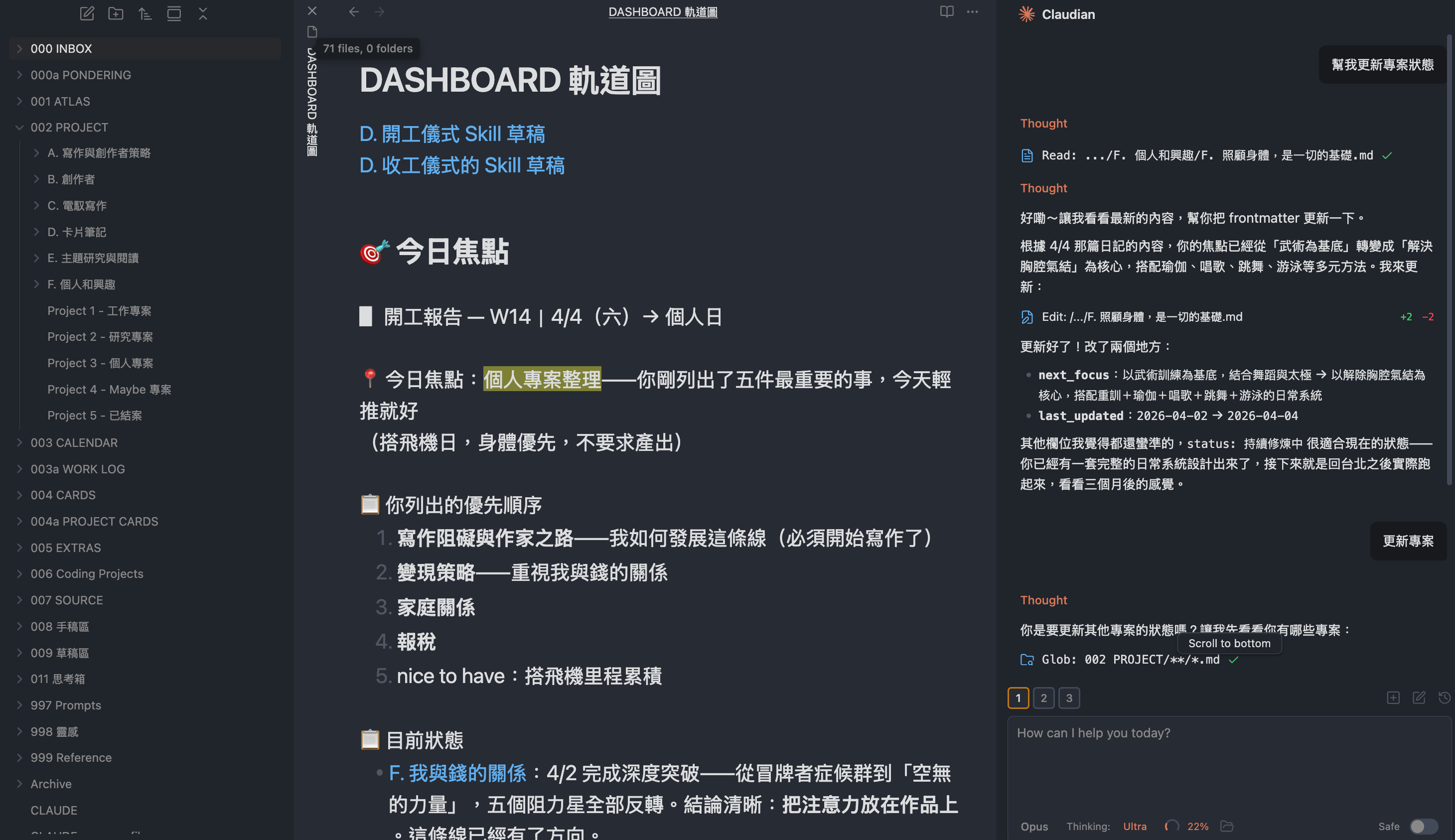 自從開始運轉這個「電馭大腦」之後,大腦不再擔心自己忘掉了什麼事情,面對困難模糊的工作問題也有一把清楚的刀子可以切分,有一個強大的 Claudian 與你分析——每天的日常工作,似乎變成一種「工作禪」,在心流中看著資訊流,是很奇特的感覺。